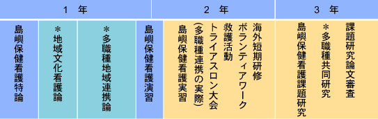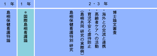 ・島嶼保健看護特論 I 、島嶼保健看護演習、島嶼保健看護実習、島嶼保健看護課題研究または島嶼保健看護特別研究 I 、地域文化看護論(コア科目)、多職種地域連携論(選択科目)