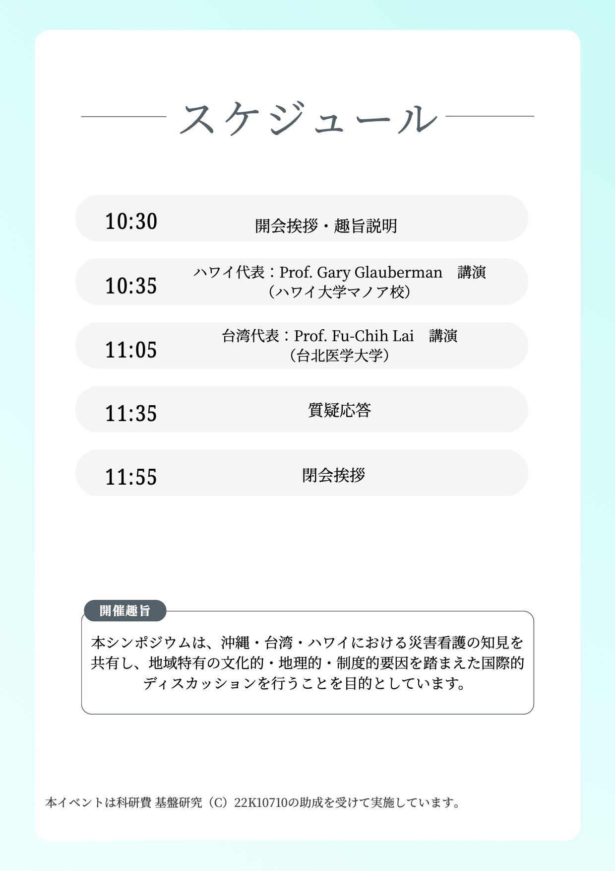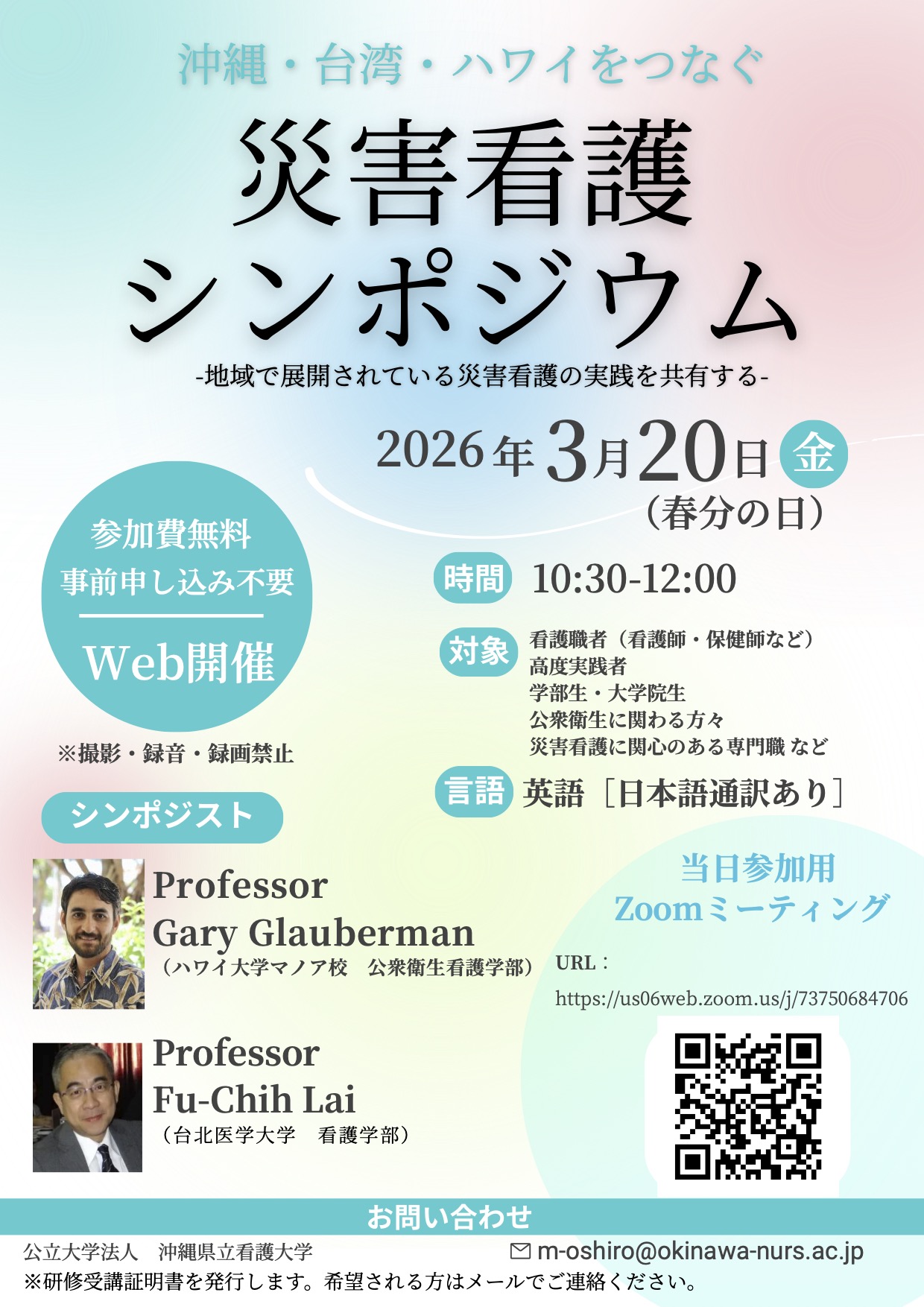 • 2026年3月20日(金)シンポジウムのお知らせ【沖縄・台湾・ハワイをつなぐ 災害看護シンポジウム】